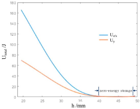 According to Equation (6), we further study the relationship between the elastic potential energy of the cell and the nominal height h of the cell. As can be seen from Figure 4, when the height is 35 as the critical point, the elastic energy changes rapidly and then changes slowly. This means that there is an obvious nonlinear elastic stage before 35 , showing a clear zero-energy mode.