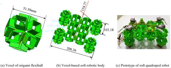 As stated previously, many attractive attributes of the origami flexiball empower it to be a promising type for use as a soft robotic voxel or robotic genetic cell (see Figure 6a). In this work, fourteen origami flexiballs are connected into an assemblage to mimic the basic form of a quadruped robot, as illustrated in Figure 6b. Owing to the fact that thermoplastic polyurethane (TPU) is a linear segmented block polymer with excellent mechanical properties of large elongation and moderate tensile and compressive strength, herein, it is adopted as the feedstock filaments to fabricate the printable origami flexiball. The finalized prototype is shown in Figure 1c. Considering that the rope-motor-driven strategy has high flexibility, a high strength-to-weight ratio, and a possible small bending radius to suit the size and strength of the proposed origami structure, the rope-motor-driven method is employed and consists of an SG90 servo motor, a servo holder, and ropes. Basically, the elongation and friction coefficient of the synthetic ropes are supposed to be zero, and the power of the servo motor is transferred into the elastic deformation energy of the soft dodecahedron. The SG90 servo motor has a stall torque of 1.4 when given a voltage input of 4.8 volts. The energy supply of the soft robot is rechargeable lithium battery.