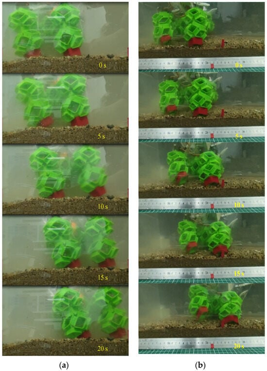 Underwater walking and crawling of the presented soft voxel-based robot on the artificial seabed. (a) Underwater walking on the artificial seabed; (b) underwater crawling on the artificial seabed.