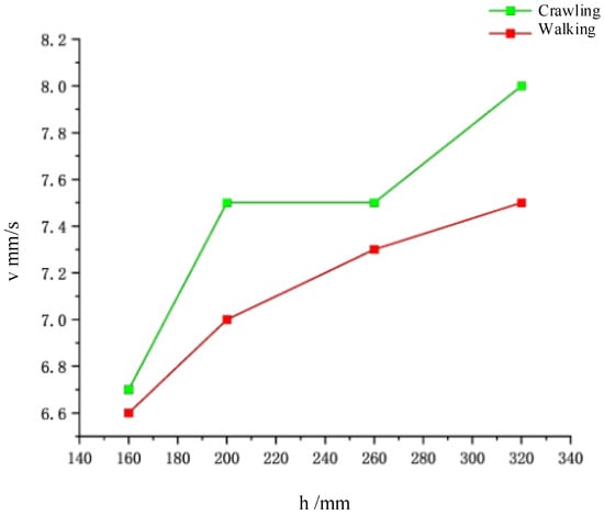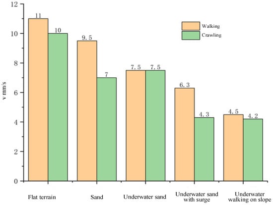 As illustrated in Figure 8, crawling and walking experiments were performed at varying water depths of 160 , 200 , 260 , and 320 . Experiments with the robot underscore that modulating stiffness improves locomotion performance based on the fluid content in a soil-like terrain. It was found that higher stiffness limbs allowed the robot to locomote fastest in sandy substrates and soft soils. As shown in Figure 9, the analysis revealed that at approximately a depth of 160 , the robot achieved speeds of approximately 6.6 for both crawling and walking. At greater depths, crawling speed increased to about 7.5 , while walking speed maintained around 7.3 .