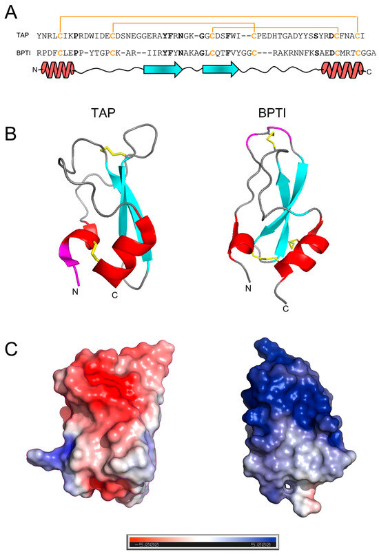 Beyond its biological function and pharmacological potential, the three-dimensional structure of TAP closely resembles that of Bovine Pancreatic Trypsin Inhibitor (BPTI), the prototype of the Kunitz family of protein protease inhibitors (Figure 1B), with which TAP shares a characteristic secondary structure content (i.e., a β-hairpin followed by a C-terminal α-helix) and disulphide bond topology [2]. Despite the structural similarity existing between TAP and BPTI, the two inhibitors display only weak sequence identity (~24%) that becomes negligible (~14%) if the conservation of disulphide bonds is not considered (Figure 1C). Furthermore, TAP and BPTI follow different pathways in oxidative disulphide folding reaction to achieve the final native structure [24] and have remarkably different thermal stabilities [25,26]. More importantly, the two inhibitors have very different selectivity toward serine proteases [27] and exploit totally different mechanisms of action for inhibiting their corresponding target proteases [9,10].