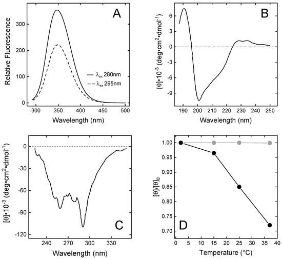Circular dichroism (CD) spectra were recorded on a Jasco (Tokyo, Japan) J-810 spectropolarimeter equipped with a Jasco Peltier model ETC-273T temperature control system [30,31]. All measurements were performed in phosphate-buffered saline (PBS), pH 7.8, at 25 ± 0.1 °C. The final spectra resulted from the average of four accumulations, after baseline subtraction.