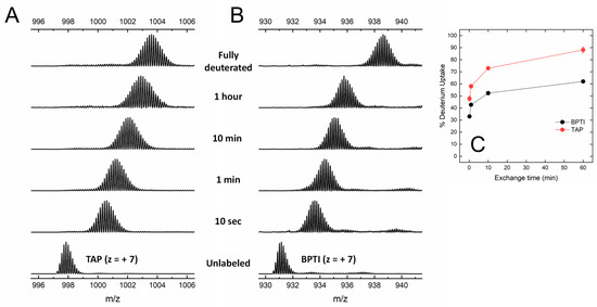 Under the conditions tested, both BPTI and TAP were largely resistant to pepsin hydrolysis, likely because the three S-S bonds present in the structure (Figure 1) impose stereochemical constrains that impaired the polypeptide chain to adapt to and be cleaved by the protease active site. The practical impossibility to run local exchange analysis prompted us to perform HDX-MS measurements in the global exchange mode, to obtain more (albeit cumulative) insights into the main-chain flexibility of TAP and BPTI. The data in Figure 4A,B show that, for both intact TAP and BPTI, the m/z centroid of the selected multiple-charged species rapidly increases with a burst-phase of %D and then gradually shifts to higher masses. This trend is indicative of an EX2 exchange mechanism, which is typical of natively folded proteins undergoing fast local fluctuations at multiple sites [33,45]. Quantitative data analysis (Figure 4C) indicates that the fraction of hydrogen ions that undergo burst phase exchange with deuterium ions in the dead time of the experiment is remarkably higher for TAP (48%) compared to BPTI (32%), indicating that TAP has a looser/more flexible structure than that of BPTI. Interestingly, the time-dependent increase in %D measured at longer incubation times follows a very similar trend with both TAP and BPTI, consistent with the overall fold similarity of the two proteins (Figure 1).