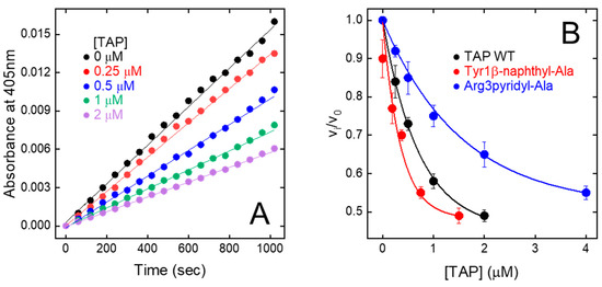 The relative initial rate of substrate hydrolysis (vi/v0) was plotted against TAP concentration (Figure 5A). The data points were analysed within the framework of the slow-tight and competitive inhibition model [32,48], allowing for the calculation of an inhibition constant (KI) of 200 ± 19 pM (Figure 5B), identical to that previously determined for the natural inhibitor (KI = 135–580 pM) [9,49,50]. Overall, fXa inhibition data provide a clear-cut indication that stepwise SPPS is a convenient method to produce reasonably high yields of fully functional TAP.
