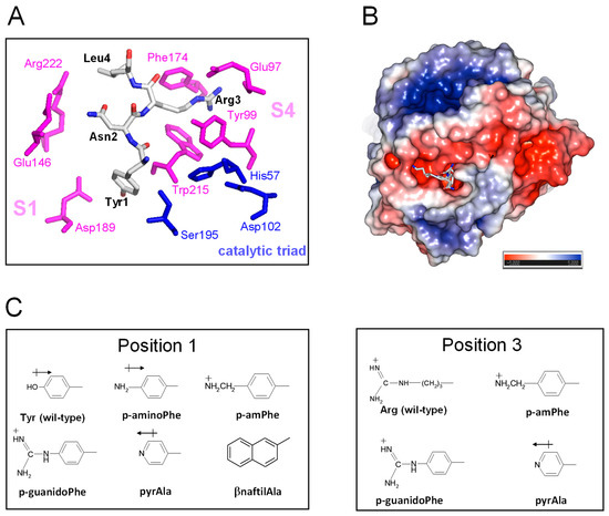 Arg3 → X. The data in Table 1 indicate that the perturbation of position 3 with the uncharged pyridyl-Ala only slightly reduced inhibition (r = 0.6), whereas the presence of the positively charged p-aminomethyl-Phe and p-guanido-Phe resulted in a remarkable loss in the affinity of TAP for fXa by 130- and 80-fold, respectively. This loss is, however, much smaller than that measured in earlier mutagenesis studies after conservative Arg3→Lys mutation, i.e., a 1150-fold decrease [50]. Notably, p-aminomethyl-Phe and p-guanido-Phe can be considered as conformationally rigid analogues of Lys and Arg, respectively. Whereas the “freezing” of side chain rotamers could enhance affinity by reducing the entropy loss of binding, it could also orient the hexocyclic charged groups in a sub-optimal conformation (Supplementary Figure S2). Our findings once more indicate that evolution selected Arg at position 3 of TAP as the best amino acid for interacting with the stereochemically constrained S4 site of fXa. In fact, the long and flexible Arg side chain can adapt to and productively interact with the “aromatic cage” in the S4 site, exploiting different physicochemical interactions (e.g., π-π and charge-π), and concomitantly harbour the carboxylate-group of Glu97′.
