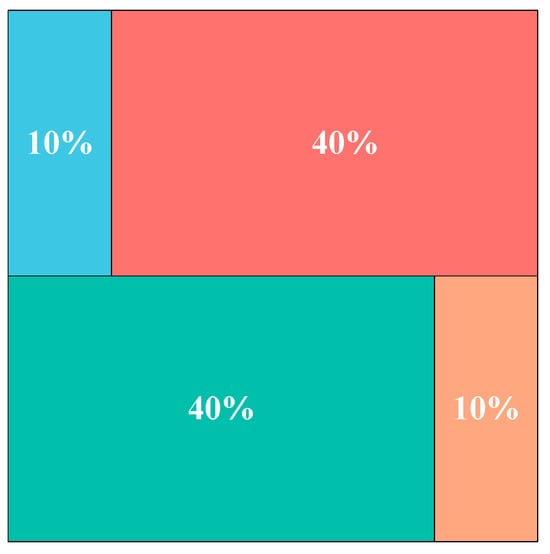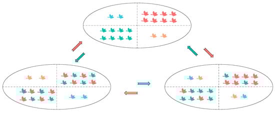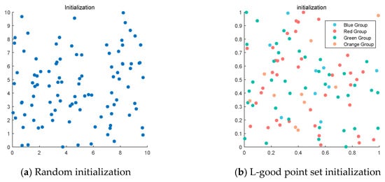 | The initial population of the fish eagle was initialized with the L-good point set using Equations (11) and (12), and then its initialized population was randomly grouped, and the red group of populations, the green group of populations, the blue group of populations, and the orange group of populations were selected according to Equations (13)–(16). |