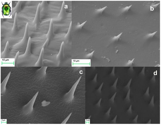 SEM images of natural microtrichia of Protaetia cuprea phoebe: Microtrichia on different areas (a,b) of dorsal side of elytron. Hindwing microtrichia from two distinct areas (c,d).