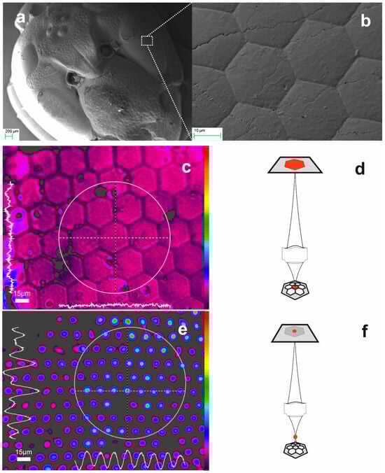 The optical image of the surface under white light illumination is depicted in Figure 8c. The focusing action of the microlenses in Figure 8d allows for the direct measurement of the microlens back focal length, which is approximately fb,f-s ~ 30 μm. Considering the systolic factor SF × 3.4, we can estimate the radius of curvature of the individual microlens element to be Rf-s ~ 14 μm. Such a high curvature is comparable only to self-assembled microsphere cast arrays [90], or nanofabricated planar arrays [91]. Recent approaches aim to provide microlens arrays spherically distributed to cover an ultrawide field of view [92]. The significant difference between these biomimetic approaches and our results is that the bioarchitectonic array covers conformally an oval surface of very complex topography, as it is endowed by nature. In fact, the radius of curvature of this surface varies significantly along the axes of vision to provide the best possible field coverage and the vision processing required by the insect. The contour schematic of Figure 8e presents anatomical details and the respective radii of curvature of the different parts, estimated here by SEM imaging and projection in the range of approximately 70 μm to 1068 μm. This clearly represents a step beyond the current state of the art.