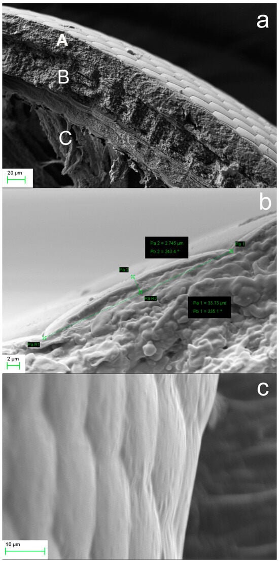 SEM micrographs of: (a) cross section of natural compound eye of hornet, where the cornea surface (A), the multilayer structure (B), and the rhabdoms (C); (b) close-up view and dimension bars, (c) aerogel replica of the compound eye at high inclination.