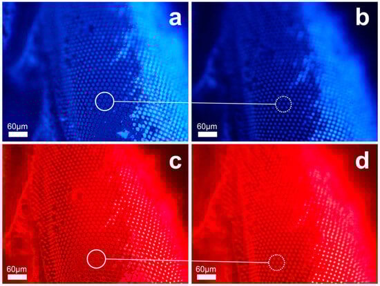 Surface (full circle) and foci images (dotted circle) formed by the thick xerogel microlens element using blue (470 nm) and red (630 nm) filtered light. Surface image (a) and foci image (b) using blue filtered light. Surface image (c) and foci image (d) using red filtered light. Microlens ensembles and the corresponding foci are indicated encircled.