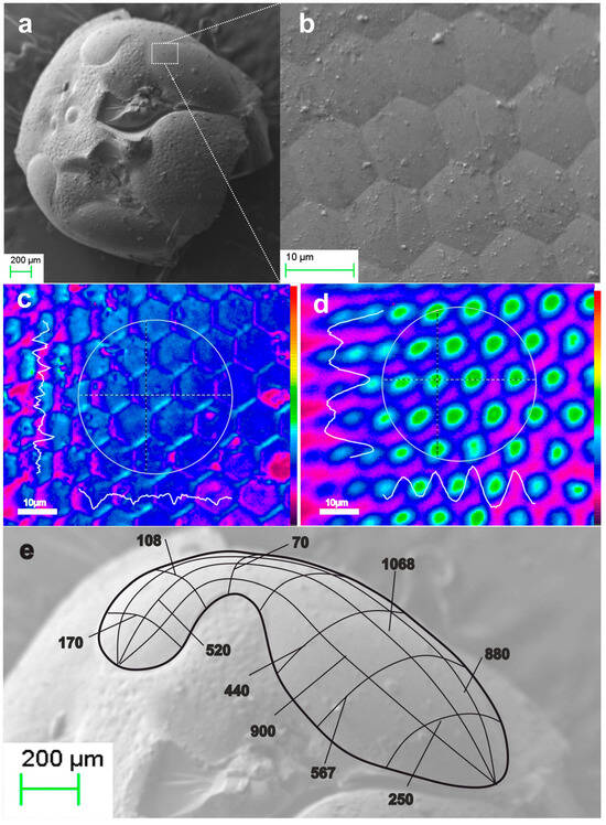 Vitrified hornet’s head replica: (a) SEM images replica (far-view) and (b) close-up view of hexagonal microlens array structure. (c) Microscope image of replica’s surface and (d) image of the respective focal spots, by use of the beam profiler. Corresponding areas of microlenses and respective foci in (c,d) are indicated encircled. (e) An anatomical contoured schematic of the compound eye surface superposed on the SEM image (a) for illustration. The values of radii of curvature of the representative contours shown are in μm.