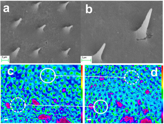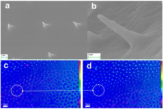 Members of the Scarabaeidae family, and generally the coleoptera, have two pairs of wings, the forewings, known as elytra, and the hindwings. Figure 2 presents SEM micrographs of microtrichia on the body of a Protaetia Cuprea Phoebe specimen. Figure 2a,b depict representative samples of the forewing elytron, which is the usually stiff member covering either completely, or partially, the abdomen. Both surfaces of the hindwings and the ventral side of the elytra are covered with microtrichia. Figure 2c,d present SEM micrographs of hindwing microtrichia. Each microtrichium is a conical element having an average height of about 10–20 μm and a base diameter of approximately 5 μm. The exact shape and dimensions of microtrichia vary depending on their specific location, as illustrated in the representative ensembles of Figure 2. Based on the SEM images, we estimate the apex radius of curvature of a microtrichium to be in the range of 100 ± 20 nm. This estimation represents the maximum value considering the limitation of instrument’s resolution and the focusing uncertainties imposed by the high curvature of the sample, together with the local surface conductivity, and the mechanical and thermal stability of the imaged tip under electron irradiation.