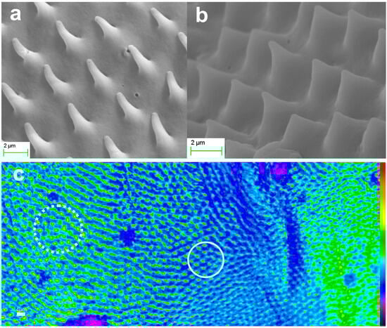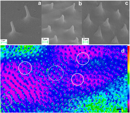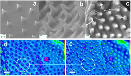 The monolithic aerogel replicas of hindwing microneedles from three different locations have also been investigated and are presented in Figure 10a–c. In this case, smaller structures are observed with an average height of 2–4 μm and a cone base diameter of ~2 μm or smaller. Figure 10d demonstrates their optical performance. The noticeable variation in surface curvature results in differing focusing conditions. Areas of interest with the image focus at the microneedle’s cone base are encircled with solid line, while areas with image focus at the nanotip are encircled with a dotted line. We underline the color change at the center of the light circle, indicating a region of high intensity resolved at the limits of detection. The reproduction fidelity at this miniaturization level is particularly noteworthy.