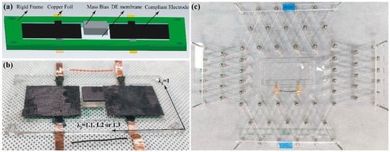 The compliant electrode [24], formulated by mixing carbon particles with vegetable oil in a 1:8 weight ratio, is delicately hand-brushed onto the DE membrane with each area of 25 × 20 mm2. To prevent tension loss, the DE is stretched lengthwise, whereas its width retains the original stretch ratio of 1. This process is achieved by the setup shown in Figure 1c, mirroring the device used for VHB membrane biaxial stretching.