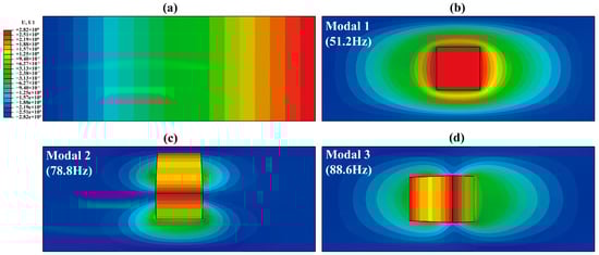 (a) The deformation in length of the silicone membrane without Maxwell stress under prestretch of 1.0 × 1.1. (b) The first-order resonance (modal 1). (c) The second-order resonance (modal 2). (d) The third-order resonance (modal 3).