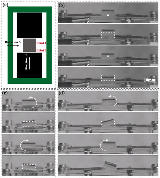 The snapshots of the RPDEA with prestretch of 1.0 × 1.1. (a) The view direction of high-speed camera (Revealer 2F04C, from AgileDevice, Hefei, China, 1250 FPS): (b,d) with direction A, while (c) with direction B. (b) E = 50 MV/m, Ω = 96 Hz (Video S1); (c) E = 45 MV/m, Ω = 156 Hz (Video S2); (d) E = 40 MV/m, Ω = 175 Hz (Video S3). The dotted boxes refer to the original position.