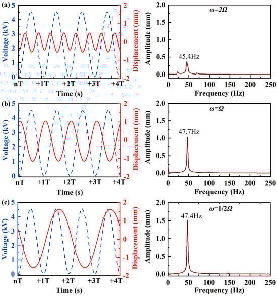 The fixed-frequency dynamic response of three peak in modal 1 resonance shown in Figure 4 under E= 50 MV/m (the left shows the response vs. time, and the right shows the DFT results). (a) ω = 23 Hz (superharmonic response); (b) ω = 47 Hz (harmonic response); (c) ω = 96 Hz (subharmonic response).