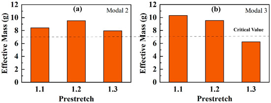The effective mass in modal 2 (a) and modal 3 (b) of prestretch λ2 = 1.1, 1.2, and 1.3, obtained from ‘Job monitor’ in FEM software.