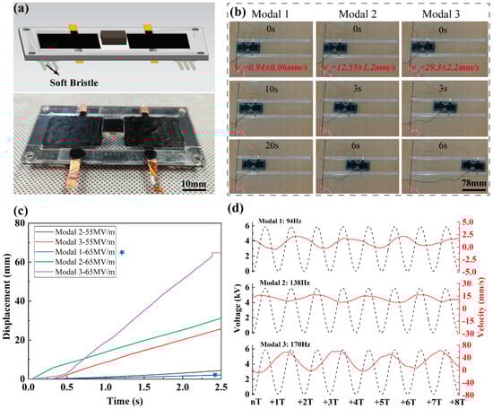 Furthermore, Figure 14c displays robot performance at E = 55 MV/m. Note that modal 1 resonance is absent under this case, implying its inability to drive the robot. This may be attributed to the dampening effect of the soft bristles. Additionally, the gradient of the displacement–time curve for modal 2 and 3 at E = 55 MV/m is steeper than that for modal 1 at E = 65 MV/m, emphasizing the advantage of higher-order resonances.