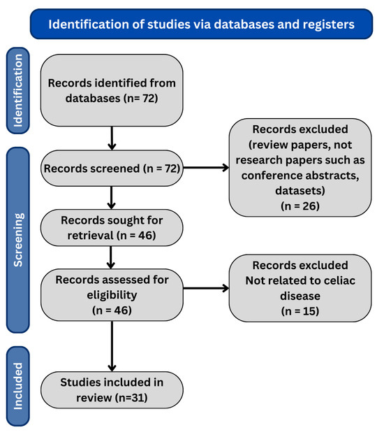 Piccialli et al. [42] applied ML methods to analyze clinical data and identify the most influential features predicting patient outcomes associated with potential CD and duodenal atrophy. Feature selection methods included univariate analysis, random forests, and extremely randomized trees, while random forests, extremely randomized trees, boosted trees, and logistic regression were used for classification. They achieved high values for accuracy, specificity, and sensitivity, with the best model being the optimized boosted trees model, which had an accuracy of 0.80, a sensitivity of 0.58, and a specificity of 0.84.