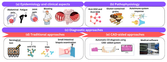 Celiac disease (CD), also known as gluten-sensitive enteropathy or celiac disease, is a long-term autoimmune condition that primarily affects the small intestine and is triggered by the consumption of gluten-containing grains. This section briefly reviews the clinical aspects of CD, its epidemiology, pathophysiology, and the traditional and CAD diagnostic methods used in clinical practice as shown in Figure 3.