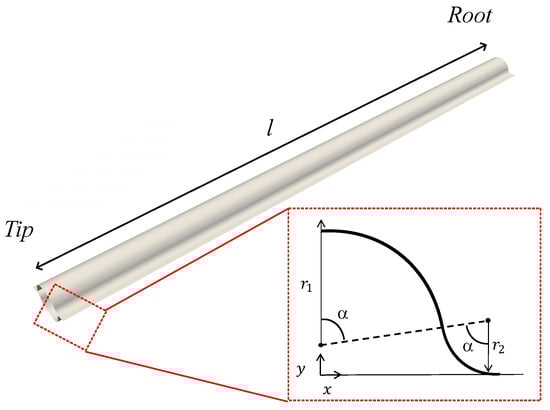 The CTM under investigation is represented in Figure 1 in its deployed configuration. It is made by two 500 mm long bi-convex thin shells, bonded along their edges. The cross-section of each shell is composed of three arc segments and two flat segments in correspondence of the bonding area. The central arc segment is associated with the radius of curvature, , and the subtended angle, ; the edge arc segment is associated with the radius of curvature, , and the subtended angle ; the flat segment is associated with its length, w. The subtended angles of both arc segments must be equal (), to prevent kinks and maintain tangent continuity.