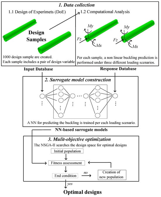 In this study, we focus on finding the combination of cross-sectional parameters and that maximize the nonlinear buckling loads of the CTM considering idealized geometries, i.e., without imperfections. To this extent, the proposed methodology consists of three steps: data collection, surrogate model construction, and MOO. The data collection steps consists of two stages: design of experiment (DoE) and creation of the response database. Thorough the DoE process, a set of initial design samples is created and the corresponding response database is then evaluated through computational analysis via FEA. The design samples and response database constitutes the data collection which serves as the basis for constructing the surrogate models. The construction of the surrogate models consists of building models capable of accurate prediction for the buckling behavior. The NN-based surrogate models are built by training a NN with the data acquired during the data collection step. The predictive capability of the NN-based surrogate models are validated using statistical error function. Finally, a MOO is performed to find optimal cross-sectional designs that maximize the buckling loads of the structure. For the MOO process, the NSGA-II algorithm is used. Each individual in the NSGA-II consists of a set of the variables fully describing the cross-sectional geometry. The surrogate models are embedded into the NSGA-II algorithm to assess the buckling loads value of each individual, which serves as their fitness score. Iteration after iteration new individuals are generated through selection, cross-over and mutation mechanisms, and these individuals are evaluated using the surrogate models to determine their objective values. The iteration stops when the optimal designs are found. The workflow of the proposed methodology is shown in Figure 2.