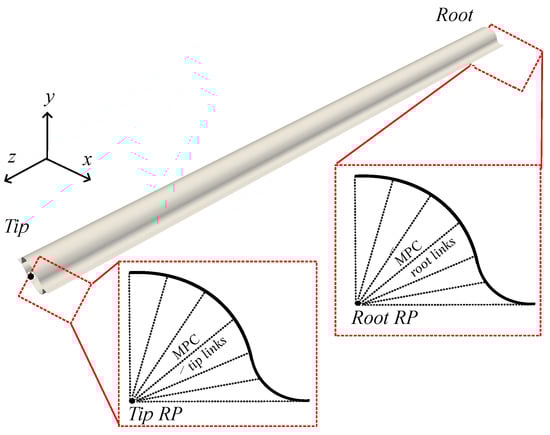 Multi-Point Constraints (MPCs) used in the present study to apply boundary conditions (BCs). The edge nodes at the root cross-section and the edge nodes at the tip cross-section have been associated with a root and a tip reference point (RP), respectively.