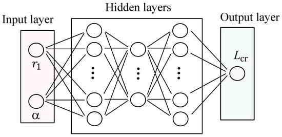 Finally, determination of the architecture of the NN includes determining the input layer, the output layer, and the hidden layers, and the corresponding number of neurons for each layer. The number of neurons in the input and output layers can be determined according to the number of input variables and output variables. In this paper, the input variables are the radius of the central arc segment, , and the subtended angle of both arc segments, , while the output variable is the non-linear buckling prediction. A generic architecture with the specific input and output layer for the present study is shown in Figure 4.