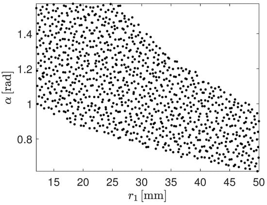Figure 5 displays the 1000 DoE points generated using the Sobol sequence applied to the two design variables, and . The design samples do not span the entire design space that would be covered if solely the constraints on and were considered. In fact, the lower and upper limits for must also be enforced for . Given the need to validate the and pairs to ensure that the corresponding value falls within the limits for , the design space is further restricted beyond the constraints on and alone, as shown in Figure 5.