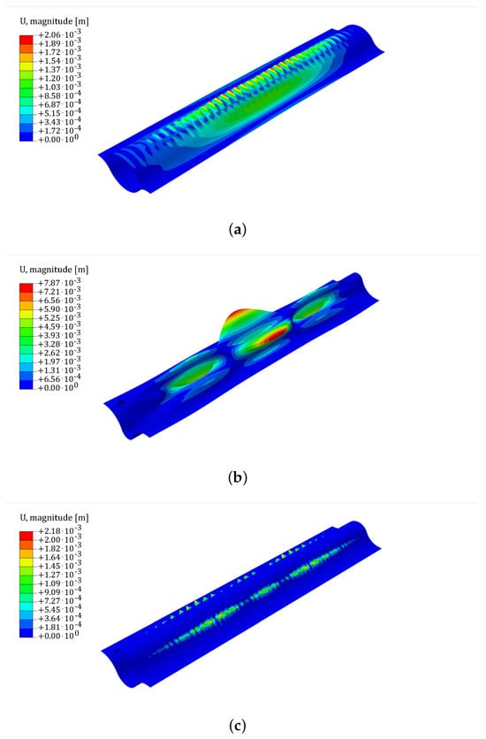 Buckling patterns for non-linear buckling in the bending moment about the x-axis scenario: (a) Wrinkles on central arc segment. (b) Wrinkles on edge arc segment. (c) Diamond wave pattern. The scale-plate is shown in the figure with the magnitude of displacements expressed in m. In the deformed configuration, the magnitude of displacements has been amplified by a factor of 5.