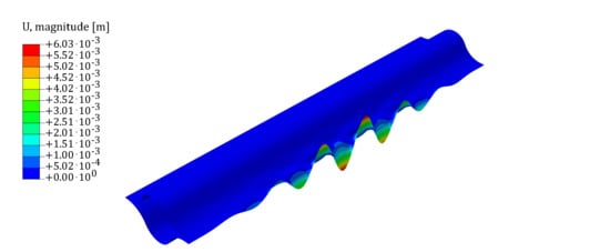 In the scenario of a bending moment around the x-axis, three non-linear buckling patterns can be distinguished: wrinkles in the central arc segment, wrinkles in the edge arc segment, and finally a diamond pattern, as shown in Figure 7.