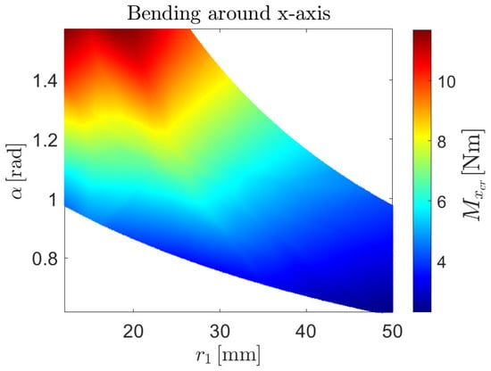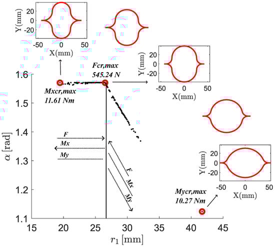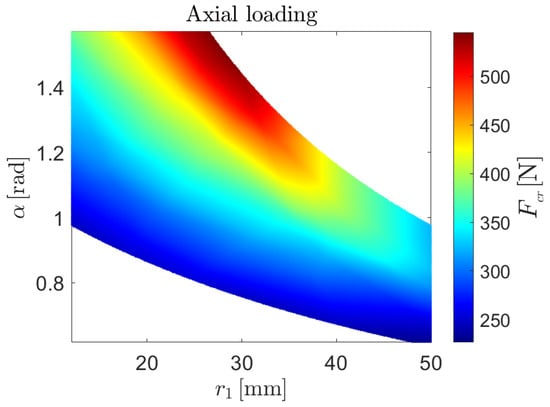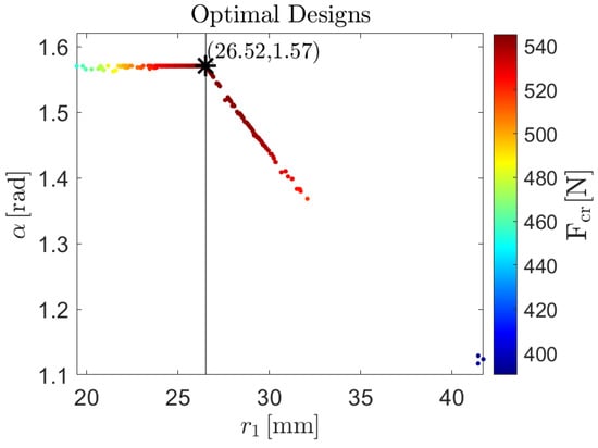 In Figure 17, the cross-section parameters leading to a global optimum for buckling performance are shown. Specifically, the x-axis displays the value of the central arc radius, , and the y-axis displays the value of the subtended angle of both arc segments. The minimum and maximum value for the optimal cross-sectional parameters are mm and mm, rad and rad, for and , respectively. A vertical line divides the optimal designs space in two regions: a left-hand region and a right-hand region. The design point having mm and rad lies on that vertical line. In the left-hand region, the values range from mm to mm, while the subtended angle takes a constant value equal to rad. In the right-hand region, the values range from mm to mm, while decreases from its uppermost value of rad to its lowest value of rad. In the right-hand region, the radius of the edge arc segment takes approximately a constant value equal to its lower limit of 12 mm. Once again, the points are colored according to the scale of the nonlinear buckling loads under axial force application, allowing for easy correspondence between points on the Pareto front and cross-sectional parameter pairs in the optimal design space.