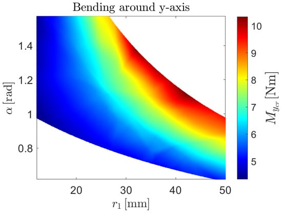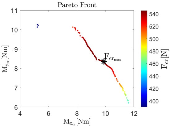 In Figure 16, the Pareto front is plotted in a 2D graph, with the x-axis showing the predicted values for the nonlinear buckling moment under pure bending around the x-axis, and the y-axis showing the predicted values for the nonlinear buckling moment under pure bending around the y-axis. The color represents the nonlinear buckling load under axial force application, as indicated by the color bar shown on the side of Figure 16. The maximum value for the three objective functions are: Nm, Nm, and N. An increment of the critical buckling moment around the x-axis always corresponds to a decrement of the critical buckling moment around the y-axis; these objectives are always competing. The relations between the critical buckling moment around either the x or the y axis and the critical buckling load is not as straightforward.
