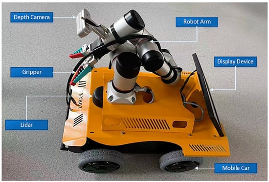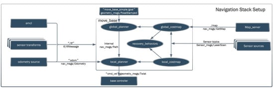 To meet the experimental requirements, a Lidar system was used for mapping and autonomous navigation. After comparison and selection, the gmapping algorithm was chosen. This algorithm uses particle filter technology to separate map creation and localization. Its advantages include low computational demand and relatively high accuracy. However, its limitations are that it is only suitable for small to medium-scale environments. During the autonomous navigation process, the robot first selects a global path algorithm, Dijkstra, to generate an optimal path from the robot’s current position to the target location. The Dijkstra algorithm is a classic global path algorithm, but it is not suitable for larger-scale path planning, as it has high spatial complexity and a poor adjustment ability in dynamic environments. To overcome these shortcomings, the A* algorithm and the TEB (timed elastic band) local path algorithm were combined. The former introduces a heuristic function, making the global path search more efficient, while the latter ensures that the robot can dynamically avoid obstacles, such as suddenly appearing people or objects. Other improvements include the combination of multiple cost map layers, such as the static map layer, obstacle layer, and inflation layer, providing more accurate environmental information and more precise path planning. The main parameters of the path-planning algorithm are shown in Table 2 below. The global cost map is represented as “/map”, indicating that the global map coordinate system is a static reference coordinate system. The global map is static, representing the entire environment map used for global path planning. The local cost map is set as “/odom”, representing the odometry coordinate system, which is dynamic and changes with the movement of the robot. Due to issues, like wheel slippage, in wheeled robots, there is some error in the odometry data, which leads to errors in the robot’s position and orientation. Therefore, an IMU sensor is used to provide calibrated odometry data to help compensate and correct these errors, improving localization accuracy. As shown in Table 2, some key parameters include dt_ref and dt_hysteresis, which determine the reference value of the time step and the hysteresis time to ensure the smoothness and real-time performance of path planning. Max_vel_x and max_vel_theta define the robot’s maximum linear and angular velocities, ensuring stability during movement. Acc_lim_x and acc_lim_theta set the acceleration limits for the robot to prevent instability caused by sudden changes in speed. Yaw_goal_tolerance and xy_goal_tolerance define the allowable error range when the robot reaches the target point, ensuring precise localization. Inflation_dist and inflation_radius are used for setting the distance and radius of obstacle inflation, ensuring safe obstacle avoidance for the robot. Weight_kinematics_forward_drive and weight_kinematics_turning_radius are used to optimize the robot’s kinematic model, ensuring efficiency in forward movement and turning during path planning. Update_frequency and publish_frequency set the update frequency for global and local cost maps and the publishing frequency of ROS topics to ensure data timeliness and system responsiveness. Cost_scaling_factor and weight_obstacle set the scaling factor for the cost map and the weight of obstacles to optimize obstacle avoidance behavior in path planning. These initial values are based on the default values provided by extensively tested ROS packages and were subsequently adjusted through actual experiments to suit specific situations.