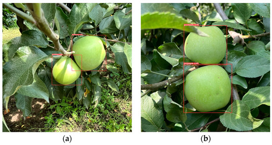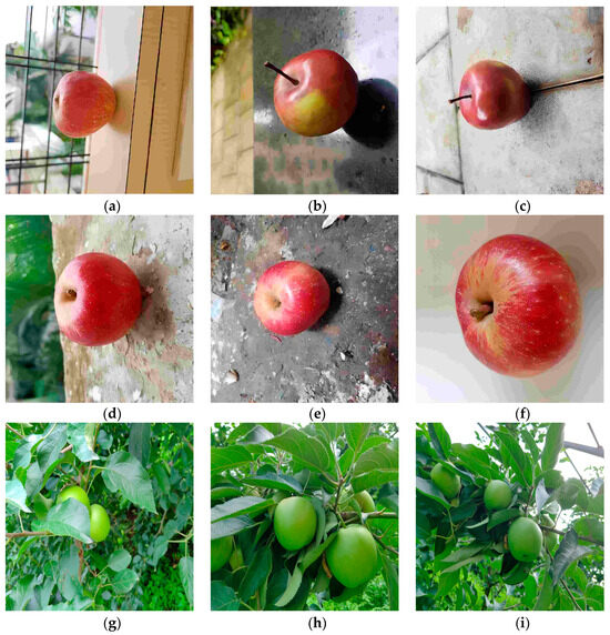 The dataset for this study is derived from two sources: online resources and natural orchard conditions. From the online resources, we selected a total of 2044 apple images under various lighting conditions, with clear quality, and with both indoor and outdoor backgrounds at different angles. These images were stored in the JPG format. To enrich the dataset and meet the requirements of real-time detection by robots in complex agricultural scenarios, we collected additional data in July 2024 at the orchard base of Jilin Agricultural University in Changchun, Jilin Province, China. The collection device was an iPhone 13 smartphone, generating images with a resolution of 4096 × 3072 pixels, also stored in the JPG format. To ensure the randomness and diversity of the images, 1026 orchard apple images were obtained from different angles, different sizes, and various levels of occlusion and backgrounds in a complex orchard environment, as shown in Figure 2.