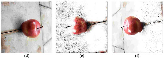 Augmented apple images. (a) Add and noise result; (b) CLAHE result; (c) Salt and transl result; (d) H-flip and v-flip result; (e) Dropout and edge result; (f) M-pool and edge result.
