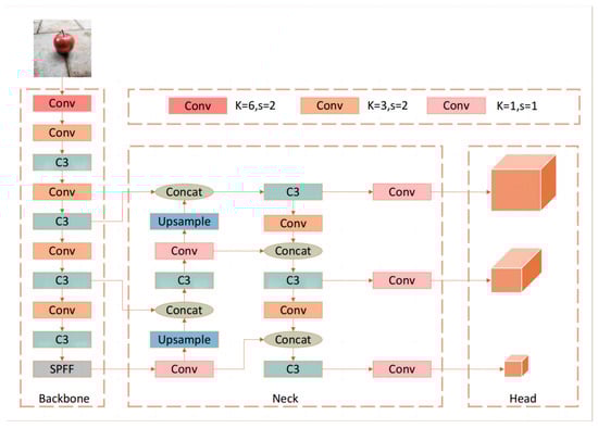 To identify and locate apple targets, YOLOv5 was utilized. This network is the fifth iteration of the YOLO series and not only surpasses its predecessors (YOLOv4) in detection accuracy but also boasts a compact model that saves computational power, making it suitable for mobile deployment. Its architecture is divided into three main parts: the backbone network, neck network, and head network, each with their own distinct function. The backbone network is responsible for feature extraction from the input images. In addition to conventional convolutions, it incorporates the CSP (cross-stage partial) structure; the CSP structure is applied in the C3 modules in the diagram below. This divides the feature map into sections before merging them through a cross-stage structure. This method significantly reduces redundant computations, decreases the computational load, and enhances the fusion of features across channels. The neck network is responsible for the fusion of shallow features (such as the color, texture, shape, and contour of apples) with deep semantic features. It adopts the FPN (feature pyramid networks) structure and has been improved to enhance the feature fusion capability. The FPN structure is applied in the neck part of the diagram below to enhance the feature fusion capability. Next, the head network uses the fused features from the neck network to predict the bounding boxes and class probabilities for each apple detection object, essentially being responsible for the final localization and classification of objects within the image. The network model is shown in Figure 4.