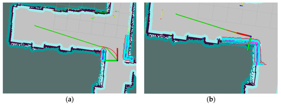 Robot navigation path diagram. (a) The robot’s initial path planning with LiDAR-based obstacle avoidance and local path adjustment at the corner; (b) The robot follows the predetermined route to the destination.