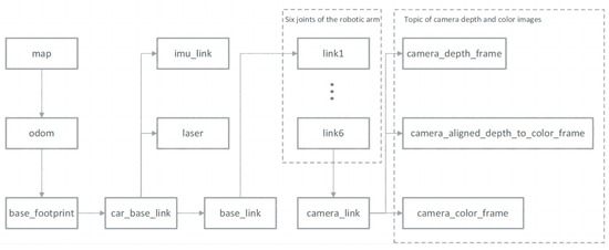 In ROS, tf is used for coordinate transformations between different parts of a robot, abstracting each component of the robot into individual three-dimensional coordinate frames. It primarily consists of a broadcaster and a listener, which are responsible for broadcasting translational and rotational transformations between coordinate frames, thereby determining the transformation relationships and relative positions of various components. Each node frame represents a coordinate frame, and arrows indicate transformations between frames. The ‘map’ acts as the global coordinate frame, serving as the parent node for other coordinate frames; ‘odom’ represents the robot’s odometric frame, used to track the robot’s position and movement in space; ‘base_footprint’ represents the robot’s physical base coordinate frame, which links various sensor coordinate frames, such as the inertial sensor frame (imu_link), radar coordinate system (laser), the coordinates of each joint of a six-degree-of-freedom robotic arm (link1-link6), the depth camera coordinate frame (camera_link), etc., as shown in Figure 7. Through tf transformations, the transformation relationship between the camera coordinate system and the robot’s base coordinate system is obtained, and the coordinates of the apple in the base coordinate system are broadcasted and listened to.