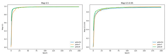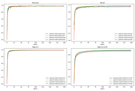 As shown in Figure 10, 200 training rounds were conducted on the same training set to test the intuitive changes in various metrics for 4 different YOLOv5 models. The precision, recall, and mAP0.5 of the four YOLOv5 models on the apple training dataset have converged, and the differences in mAP0.5 are relatively small.