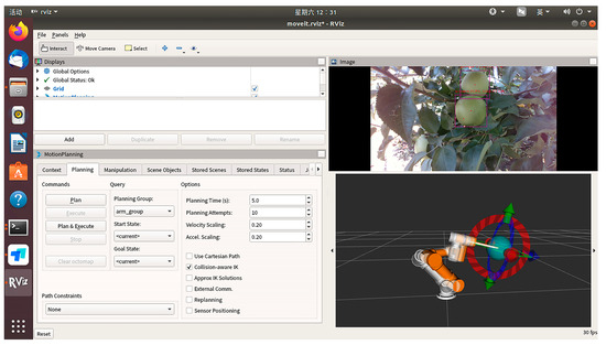 After assembling the SDK and drivers for the D435i camera in the ROS system, the system subscribes to the color images of apples, aligned depth maps, and camera intrinsic parameters from the camera. Using the formula described in Section 2.4, the spatial coordinates of the apple targets identified by YOLO are calculated. Subsequently, through tf coordinate transformations and communication with the robotic arm, the spatial coordinates of the apples in the base coordinate system of the robotic arm are obtained. Upon activating YOLO and the depth camera, the results are visually displayed in the RViz interface. Figure 12 shows the visualization software interface we use for controlling the robot. This software is based on the ROS framework and integrates the MoveIt! motion planning library to achieve motion planning and control of the robot. The top section of the software includes global options where the global status and coordinate system can be viewed and set. The following steps outline how to configure and display your own robot in the Rviz visualization interface, including creating the robot’s URDF file, setting the robot description parameters, and configuring Rviz to display the robot model. MoveIt! motion planning functionalities are used to implement path planning, path constraints, velocity scaling, and acceleration scaling parameter settings. The top right window of the visualization interface displays real-time images from the camera, processed by YOLOv5 for object detection. This is achieved by subscribing to the camera image topic, processing the image data with YOLOv5, publishing the results, and displaying them in Rviz. The bottom right window provides a three-dimensional view that shows the robot’s posture and motion trajectory in real-time. The advantages of the visualization interface include intuitively understanding the robot’s status and position and observing the YOLOv5 algorithm’s detection results. Additionally, it allows for viewing the robot’s sensor data and motion status for in-depth analysis, improving the debugging efficiency of the robot system. This provides strong support for the application of apple-harvesting robots in complex environments.