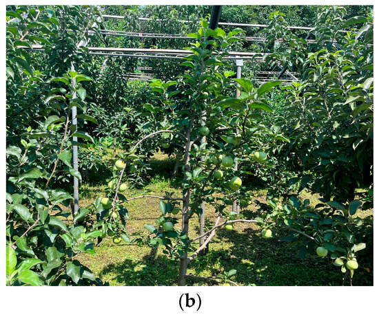 Apple orchard environment. (a) An open pathway beside the apple trees in the orchard; (b) A frontal view of more apple trees with some apples visible on the branches.