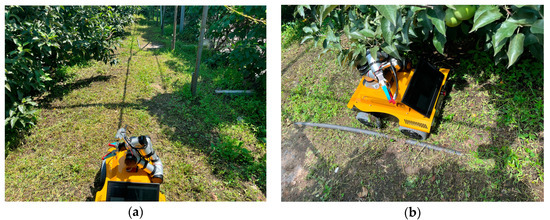 To validate the feasibility and practicality of the apple-harvesting robot’s algorithm, we conducted field tests in an actual apple orchard. Figure 13 showcases the environment of the apple orchard, which served as the test site for the apple-harvesting robot in real world conditions. The field tests aimed to assess the robot’s capabilities in autonomous navigation, obstacle detection, and apple harvesting in a real-world setting.