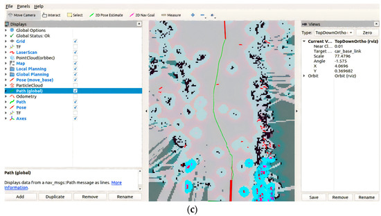 The robot uses Lidar to map the apple orchard environment for autonomous navigation and obstacle detection. Initially, the robot is placed at the starting position in the orchard, and both the Lidar and ROS system are activated. The Lidar begins rotating and emitting laser beams to measure the distances to surrounding objects. The returned laser data, including distance values from various angles, are used to draw a 2D map of the orchard environment. The gmapping algorithm is utilized for mapping, during which the robot continuously moves and updates its position on the map in real-time. The Lidar keeps scanning and integrates new data into the existing map, making it more accurate. The robot employs the adaptive Monte Carlo localization (AMCL) algorithm to determine its position within the map, ensuring precise real-time localization. Once mapping is complete, the robot can use path planning algorithms, such as Dijkstra and TEB, to plan the optimal path from its current location to the target point, dynamically avoiding obstacles during navigation, as shown in Figure 14.