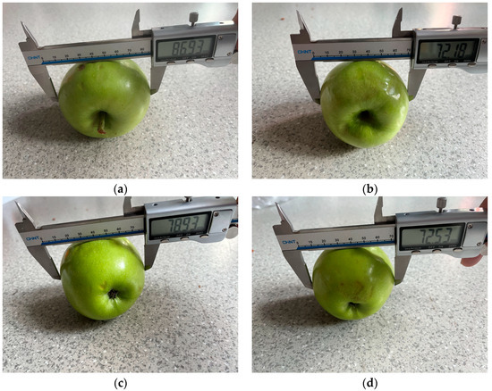 Actual measurement of apple diameter. (a) Diameter measurement of apple 1; (b) Diameter measurement of apple 2; (c) Diameter measurement of apple 3; (d) Diameter measurement of apple 4.