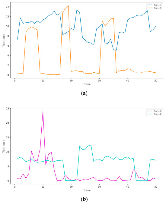 Apple variance change chart. (a) The variance in diameter measurements over 50 frames for Apple 1 and Apple 2 shows how the accuracy of the camera in measuring apple diameters fluctuates over time; (b) The variance in diameter measurements over 50 frames for Apple 3 and Apple 4 shows how the accuracy of the camera in measuring apple diameters fluctuates over time.