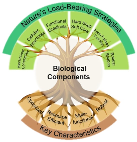 This paper provides an overview of key principles, strategies, and features that have evolved in nature for efficient mechanical load handling, as well as successful applications of these strategies in the technical domain. These strategies are organized into six main categories: hierarchically structured composites, cellular structures, functional gradients, hard shell–soft core architecture, form follows function, and robust geometric shapes. This categorization is merely intended to provide structure; however, in nature, these strategies typically occur in combination rather than in isolation. Nature’s load-bearing strategies, as categorized in our study, and their interconnectedness within biological components to achieve their beneficial characteristics, are illustrated in Figure 1.