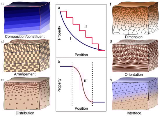 Another structural strategy observed on multiple scales in nature is the use of functional gradients. In this context, the word ‘gradient’ refers to the gradual, spatial transitions observed in natural materials and structures. These transitions appear in various forms, and different instances may involve changes in chemical compositions, micro-structures, geometries, or any combination of these. Furthermore, these gradients are evident within regions of a single material as well as at the interfaces between distinct materials or structural elements. Liu et al. [186] schematize the basic forms of gradients in biological materials and structures in Figure 5.