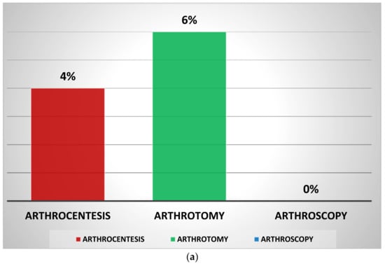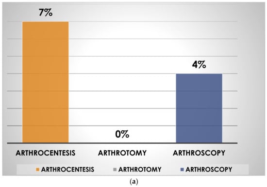 Only 4% of individuals who had arthrocentesis initially experienced clinical consequences, including ROM restriction and ongoing discomfort; 6% in patients treated with arthrotomy; and no cases in patients treated with arthroscopy (Figure 4a).